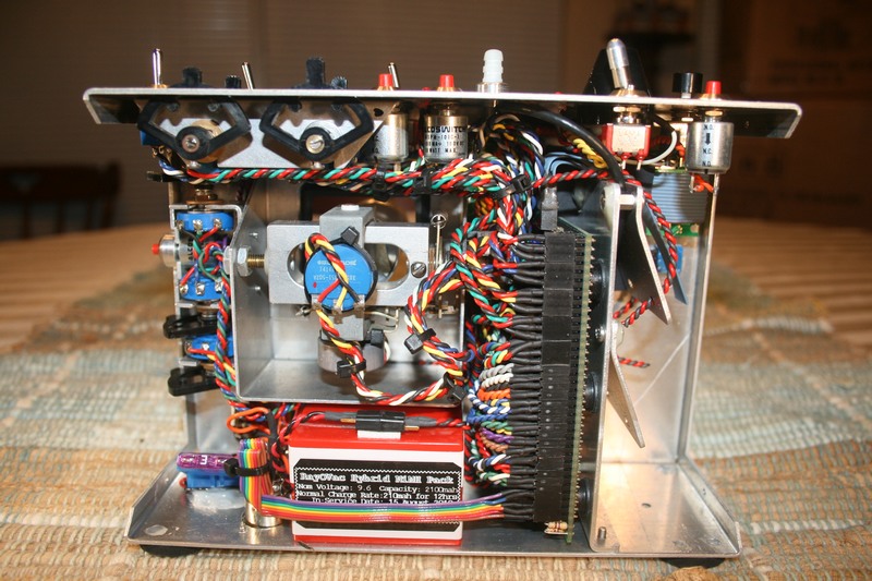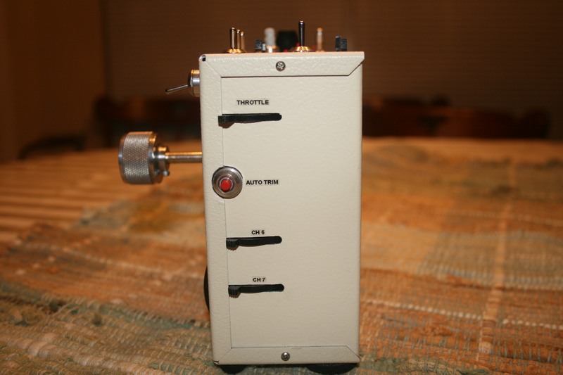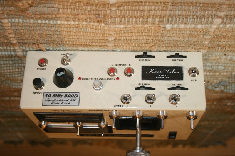 Kees asked me to update his old friend to include two 6 meter GAACE RF decks. Refreshed the stick assembly with Vishay 157 pots, new springs and spacers. Added new switches and some new features he requested. Kees wanted to build and install the RF decks hence the incomplete antenna and RF deck cable leads. He wanted nothing mounted on the case back so I had to be creative with the encoder/RF deck mount. The christmas tree arrangement is a bit unorthodox but it does the job. The gray dohickie on the case top is a screwdriver I made that fits into the display contrast hole. The ferrule it's mounted in holds the little fella tightly until it's needed.